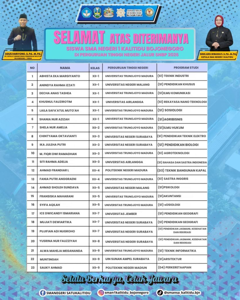 Sebagai wujud prestasi yang membanggakan, sebanyak 23 siswa – siswi SMA Negeri 1 Kalitidu berhasil lulus dalam Seleksi Nasional Berdasarkan