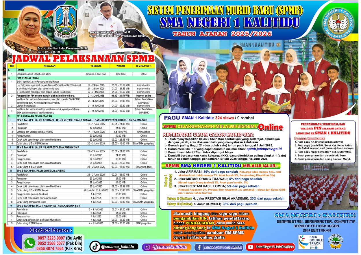 - Menghubungi langsung pihak SMAN 1 Kalitidu: Anda dapat menghubungi bagian tata usaha atau panitia PPDB/SPMB sekolah.